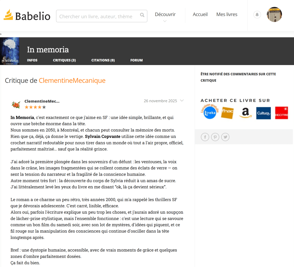 Note de l’éditeur Original, bien écrit et avec des personnages forts, ce roman plaira aux amateurs de dystopie et à ceux qui se posent des questions sur notre futur proche… Un régal ! *LE COUP DE CŒUR DE PIERRE*Montréal en 2050. Dans une société où les citoyens peuvent accéder à la mémoire de leurs morts,…